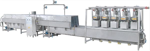 肉丸流水線設(shè)備,肉丸成型蒸煮冷卻流水線由成型、蒸煮、冷卻、傳動(dòng)系統(tǒng)、變頻控制五大部分組成。成型槽與蒸煮槽的水經(jīng)槽內(nèi)蒸汽管道加熱,水溫用高溫高壓閥通過(guò)調(diào)節(jié)蒸流器控制,達(dá)到成型槽的水溫約80度,蒸煮槽水溫為95度左右。